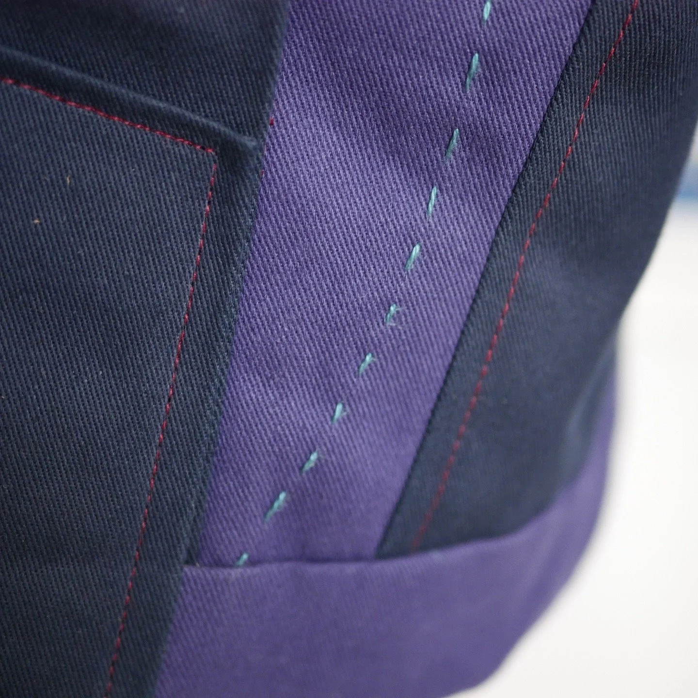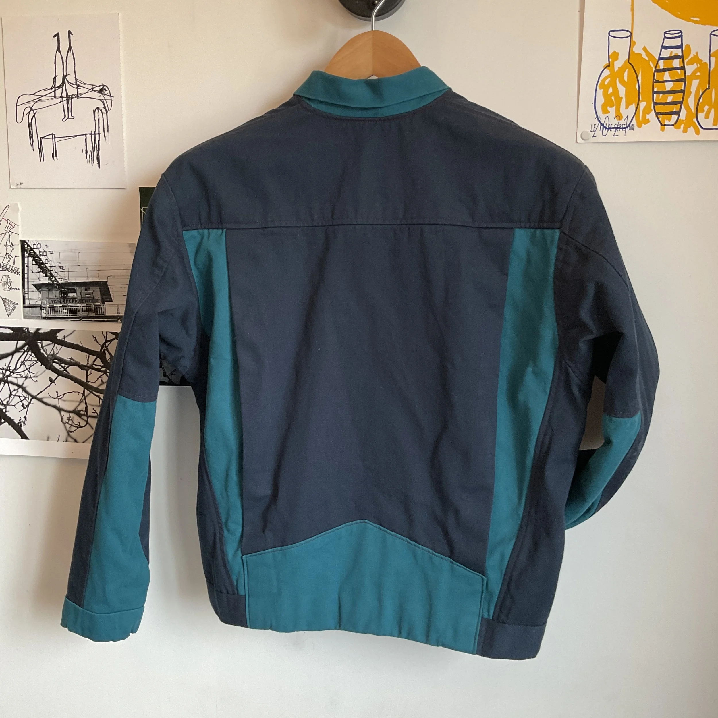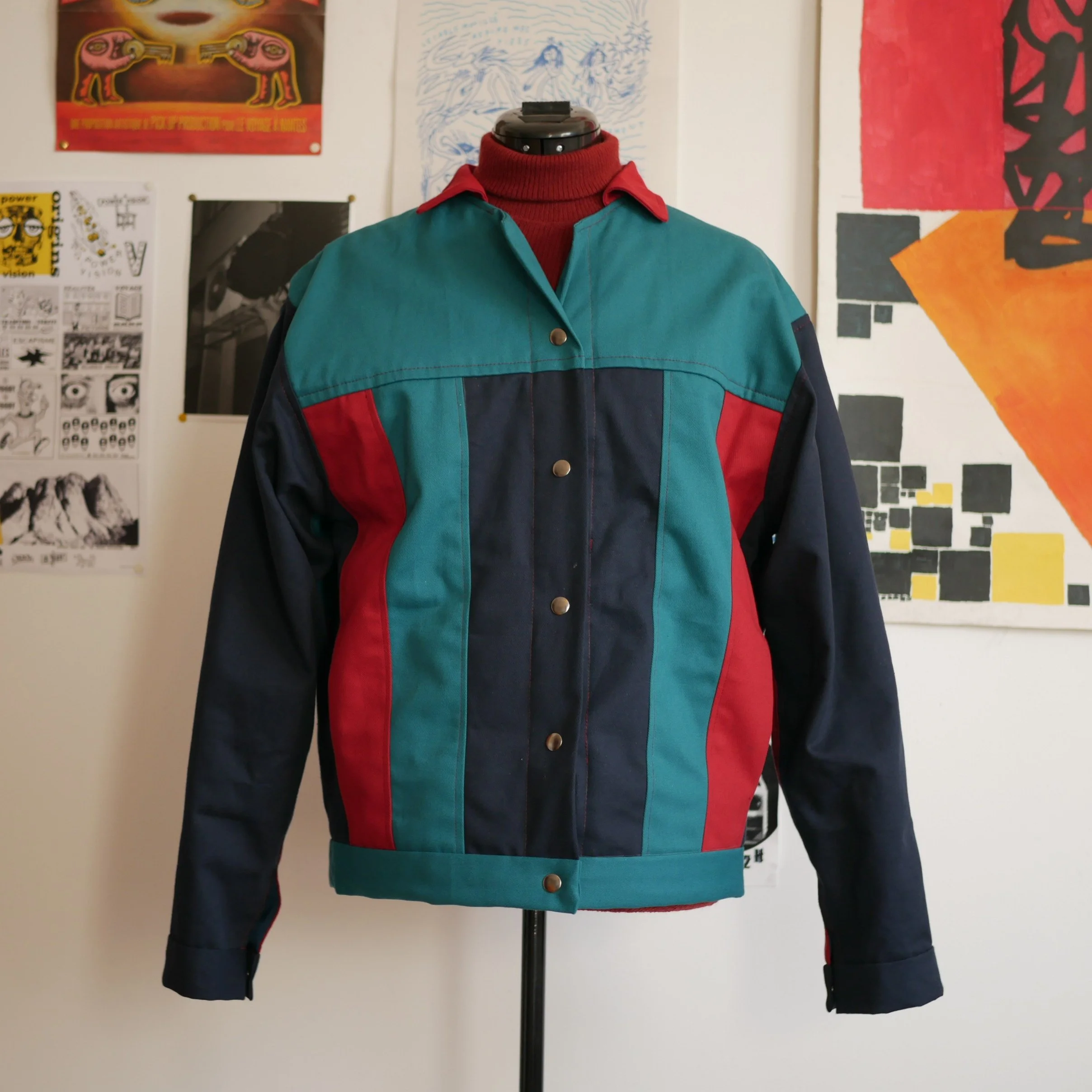 Découvrez une veste unique, inspirée des vestes en jean des années 90, alliant style vintage et artisanat moderne. Fabriquée à la main, elle se distingue par ses coutures apparentes qui dessinent des lignes graphiques, délimitant des zones personnalisables en différents tissus et couleurs. Cette coupe se réalise avec deux plis d'aisance dans le dos pour plus de confort, de grandes poches à l'avant et des manches en trois parties. Elle est fermée par des boutons pression.