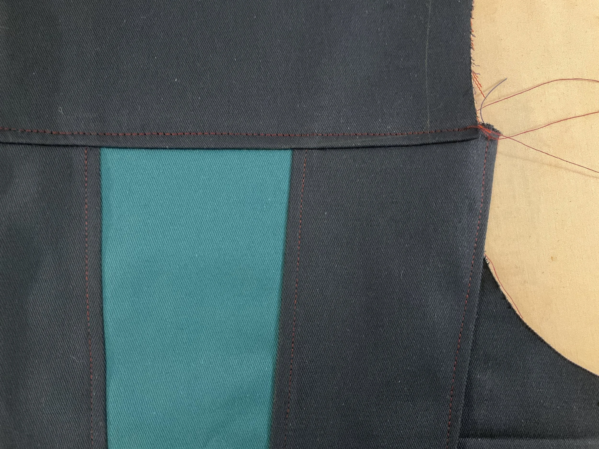 Cette veste est cousue à partir de sergé 100% coton. Le sergé est une technique de tissage, il fait apparaître une trame en diagonale (comme les jeans) sur l’endroit du tissu. C’est un tissu très solide et durable mais qui reste souple et confortable.